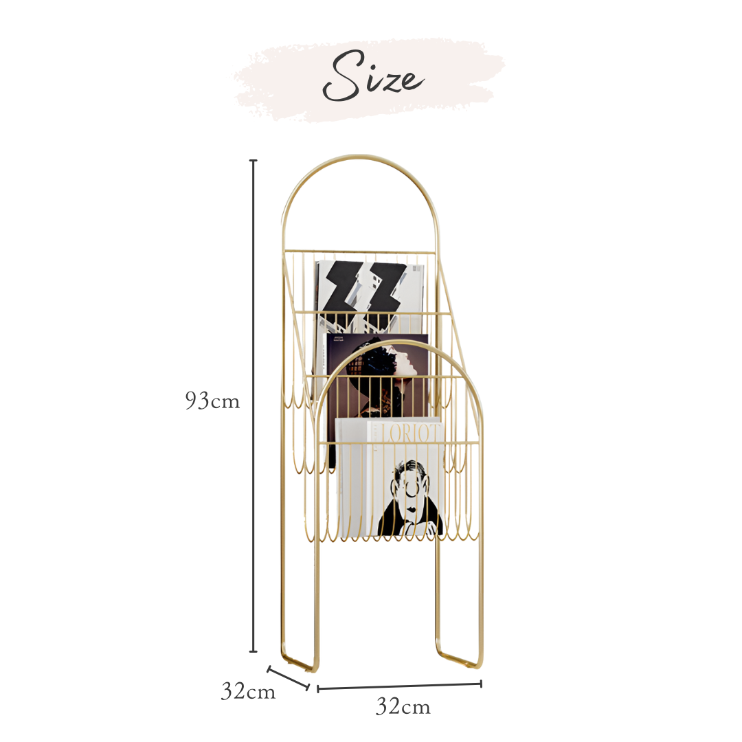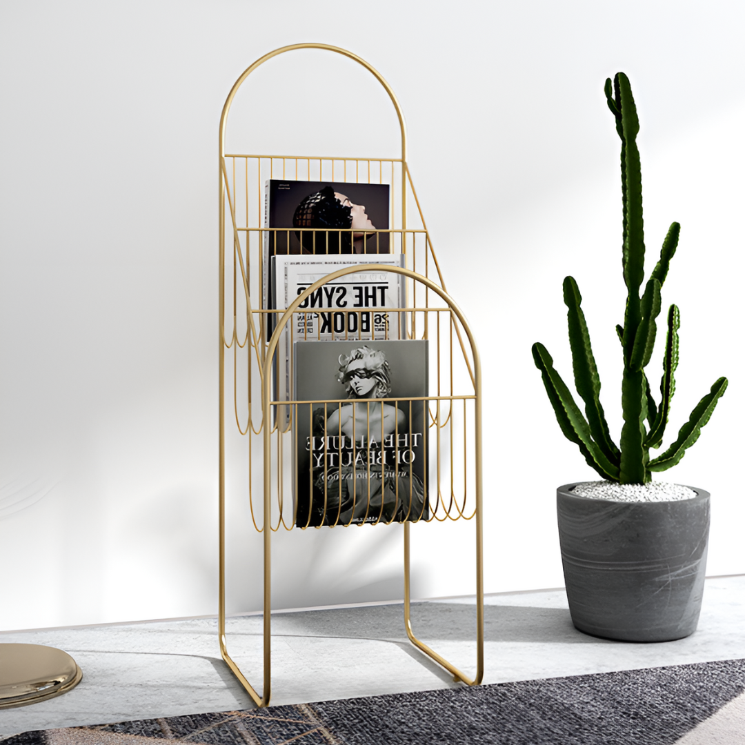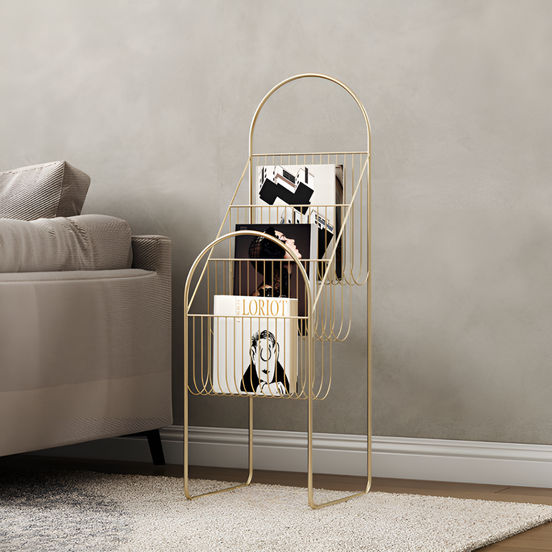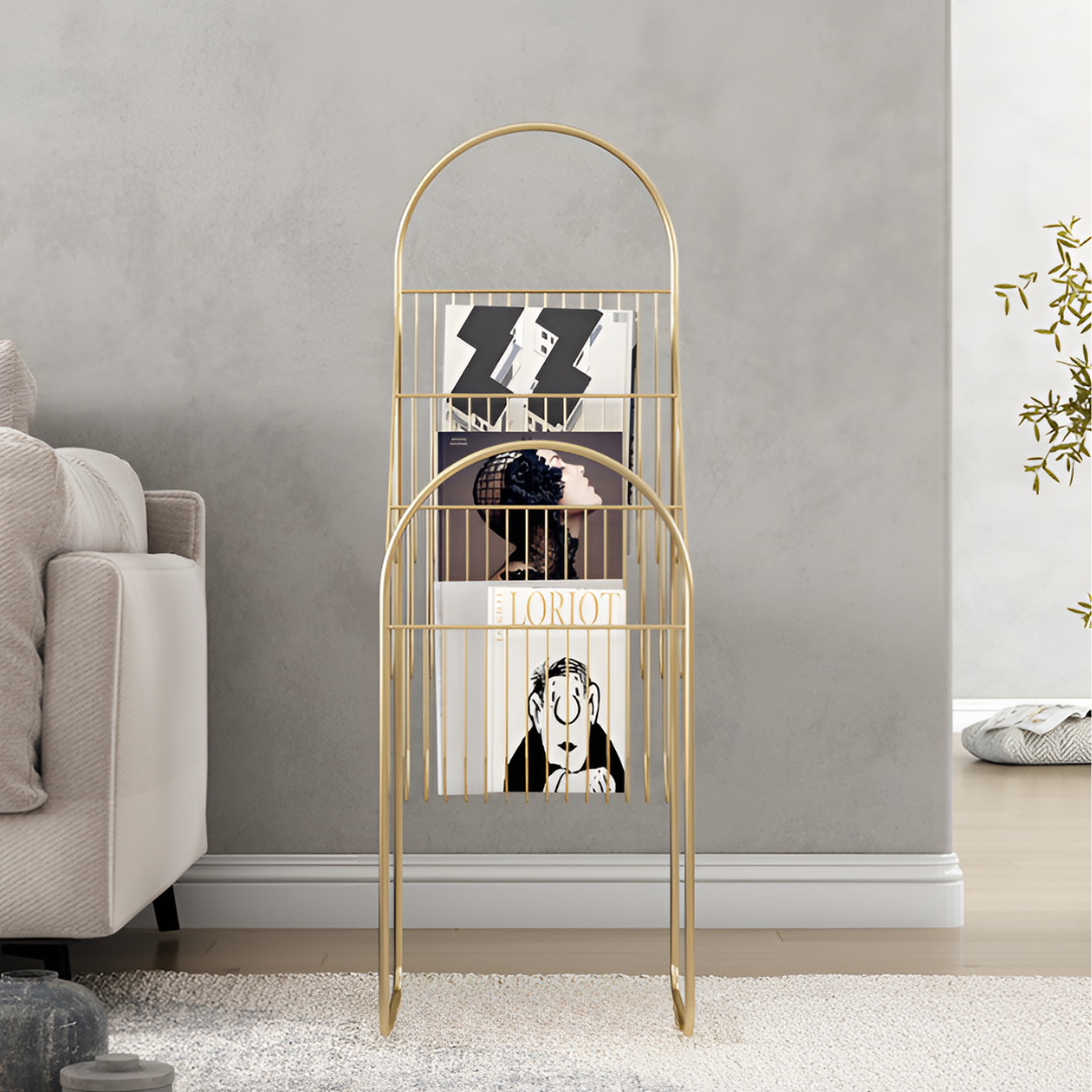 丸みのあるゴールドのフレームが美しいマガジンラック。